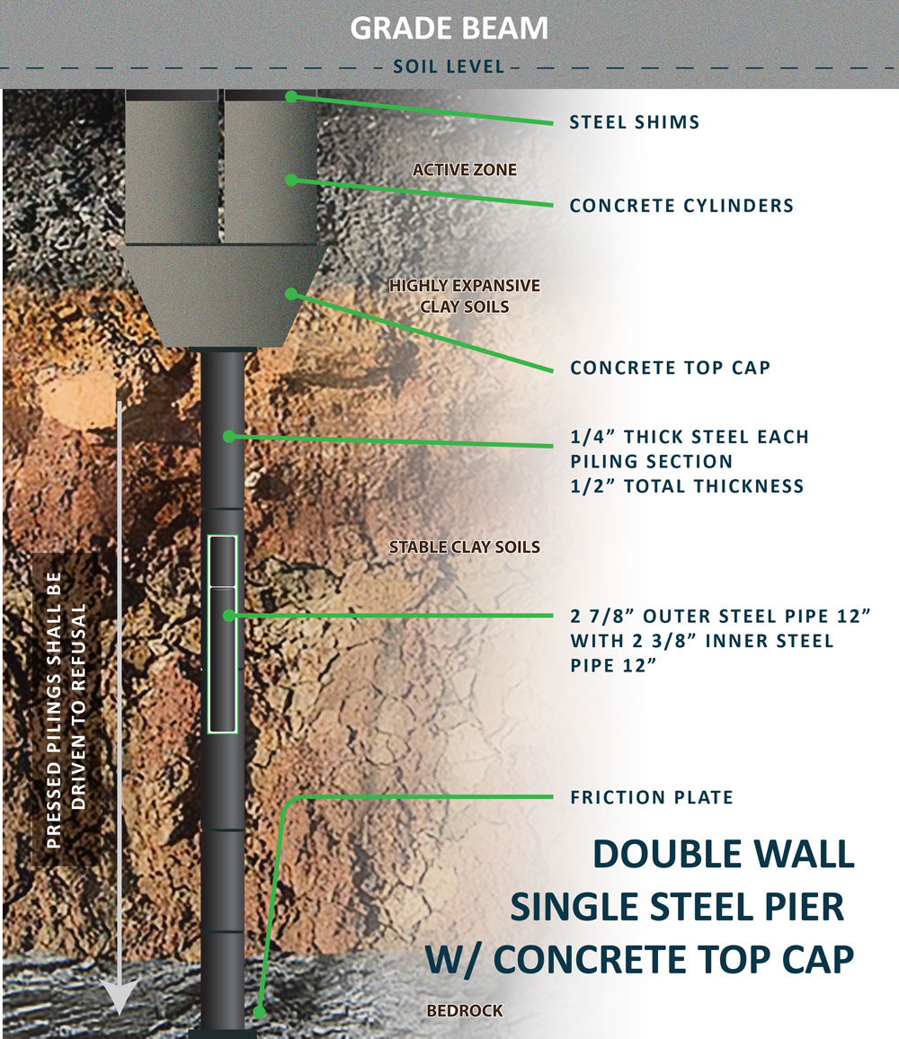 Steel piers are usually pressed directly under the foundation ,utilizing the same procedure of installation as the pressed concrete piers. This pier type offers a strong long lasting repair with the added value that in the majority of cases it can be installed at greater depths and it’s perfect to repair heavy structures due to its ability to carry greater loads.